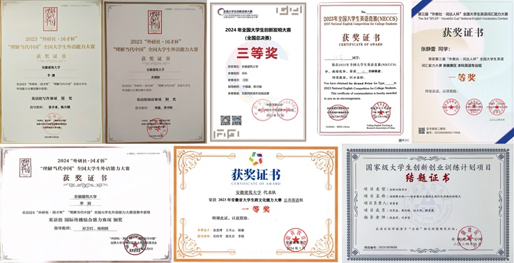近年来,英语专业紧扣“语言+文化+实践”复合型人才培养目标,整合优质资源、强化赛教融合,师生协同奋进,在各类学科竞赛中屡获佳绩。学生在国家级、省级大学生创新创业项目中立项十余项,依托“徽州古建筑国际化传播”等课题,以语言为桥探索文化传承与国际表达新路径,彰显专业实践创新活力。在语言技能类赛事中,累计斩获“外研社?国才杯”“理解当代中国”全国大学生外语能力大赛写作、阅读大赛国家级奖项3项,并在全国大学生英语竞赛中获得高等级奖项,展现扎实语言功底与国际传播能力。跨文化与实践创新领域,学生团队在安徽省大学生跨文化能力大赛中连续3年蝉联团队一等奖,于多元文化交流中尽显沟通素养;此外,在“挑战杯”全国大学生课外学术科技作品竞赛、“全国大学生创新发明大赛”等综合赛事中实现突破。