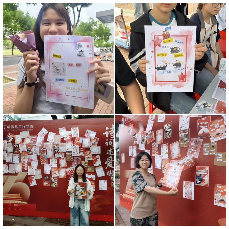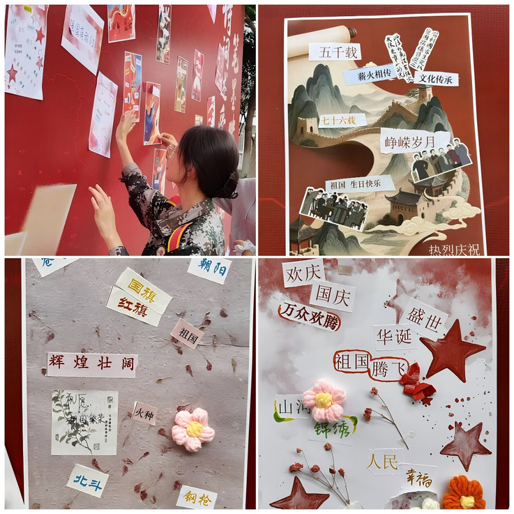 本次活动以“诗词述爱国?笔墨映山河”为主题,创新采用“拼贴诗” 形式,将国庆的庄重意蕴与诗歌的文学之美、传统文化的深厚底蕴紧密结合。活动现场精心准备了印有经典爱国诗句、山河意象(如 “长城”“黄河”“江南”)、时代发展关键词(如 “科技兴邦”“生态文明”“乡村振兴”)的词句碎片。此次活动形式新颖,内容丰富,吸引了众多师生驻足,更得到了领导和老师的充分肯定。