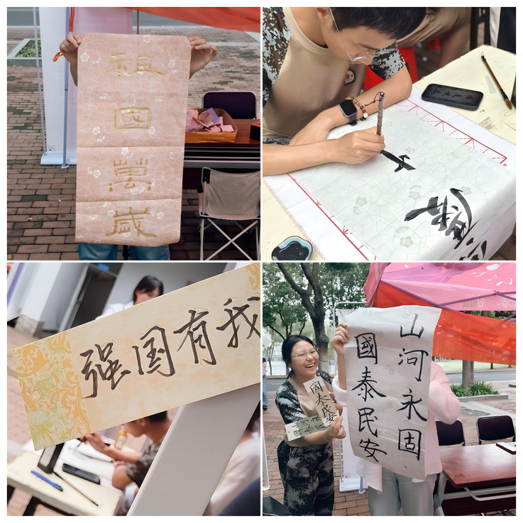 所有完成的拼贴诗统一粘贴至活动大展示板上,原本空白的展板逐渐成为一幅兼具艺术感与文化内涵的“爱国诗词长卷”。现场特设的毛笔字展示区同样人气高涨,学院前期选拔招募的多名志愿者挥毫泼墨,将“国泰民安”“山河无恙” 等祝福与 “人生自古谁无死,留取丹心照汗青”等经典爱国诗句跃然纸上。留学生们纷纷驻足观看,有的还在志愿者指导下尝试握笔书写,感受汉字笔画间的韵律与力量。有的留学生在写下“中国” 二字后兴奋地说:“毛笔字像一幅小型画作,能亲手书写中国文字,让我更贴近了中国的文化。”